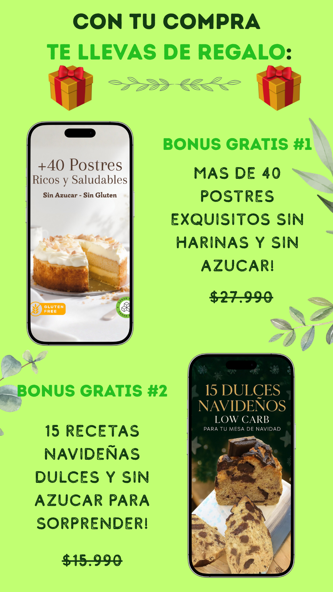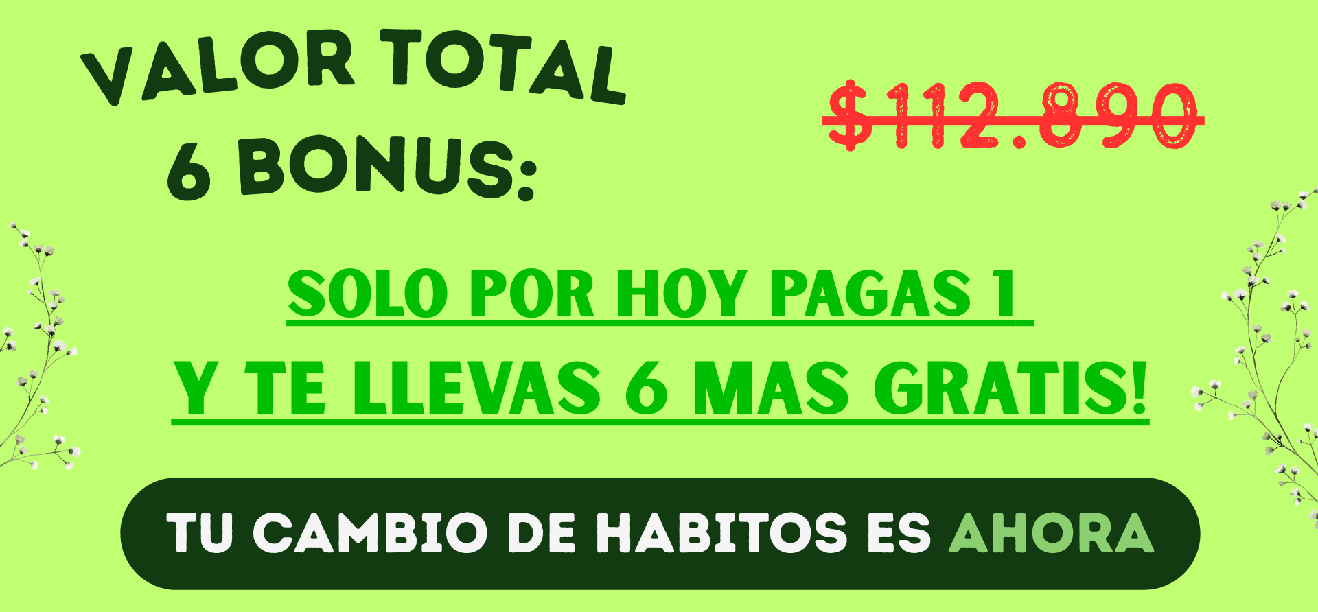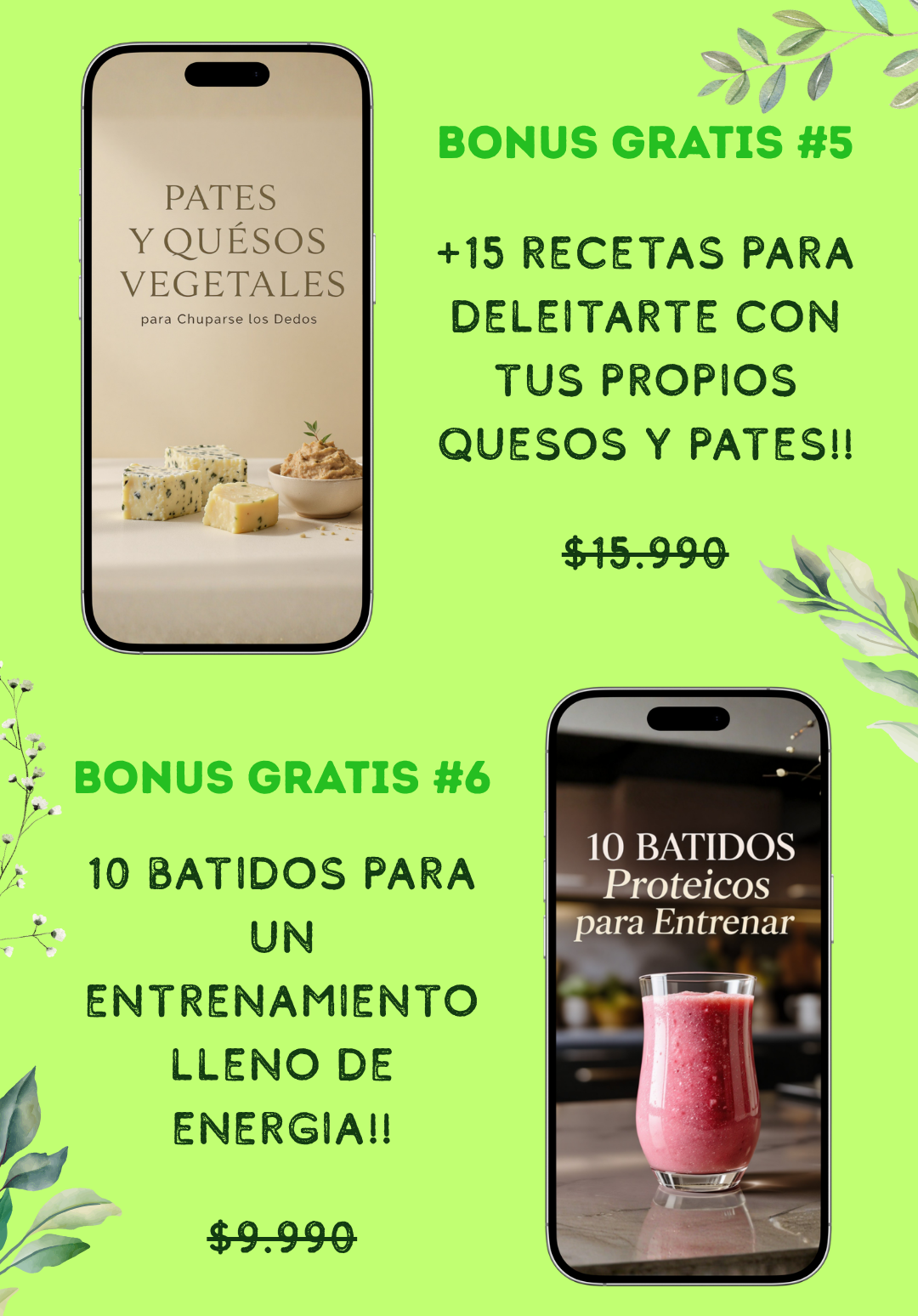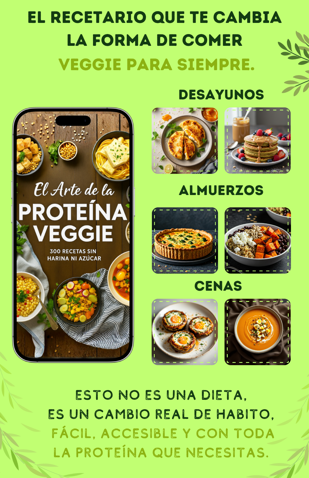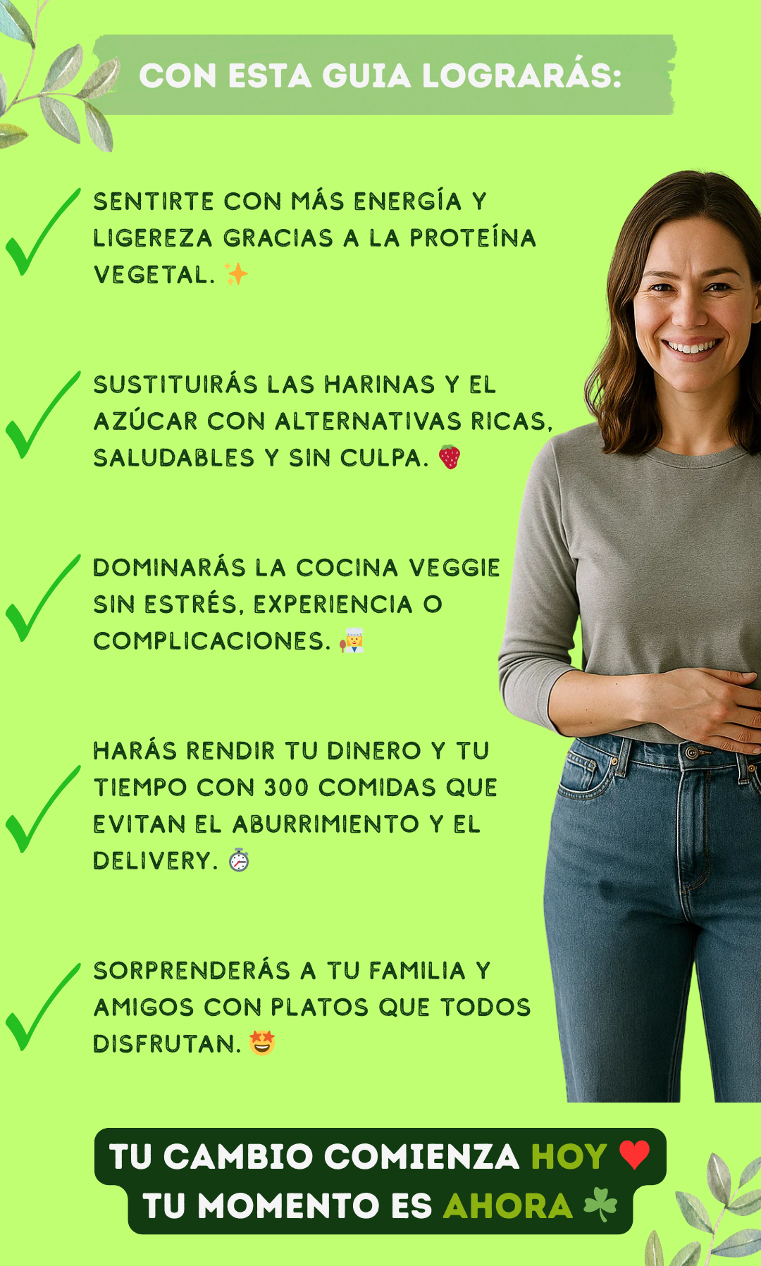 La guía principal contiene 300 recetas vegetarianas (desayunos, almuerzos y cenas), todas pensadas para tu día a día: altas en proteína, fáciles de preparar y con ingredientes accesibles. Además, recibirás 6 BONUS de regalo llenos de ideas para que la variedad nunca sea un problema.